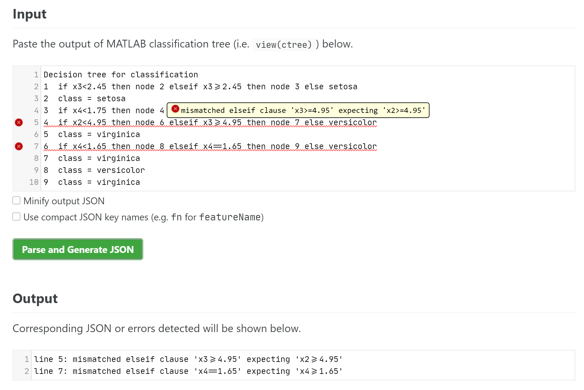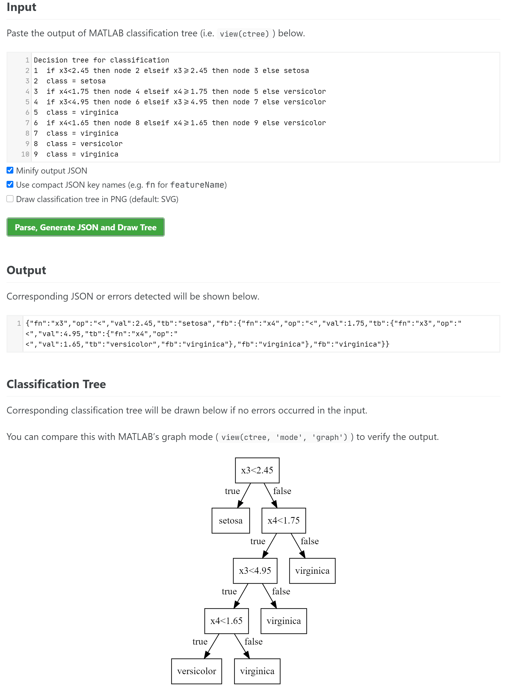 In case you’re curious, I’m using CodeMirror for the input and output editors, and Viz.js for drawing the classification tree.